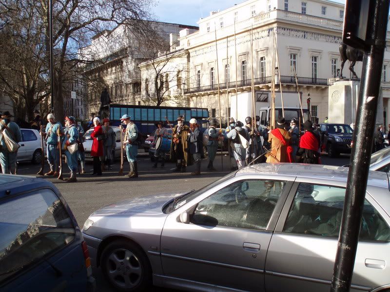 From the Piccadilly Circus station we then went off to see Buckingham Palace. On the way there we came across randomly scattered groups of people dressed up in 17th century battle outfits, complete with pikes, spears and swords. We thought that they would go off to do something interesting, but we didn’t get to experience it, although we came across them later on in London as well. So we arrived at Buckingham Palace and there were large groups of tourist waiting around and the police had blocked of the main road we decided to stay around for a bit and see if anything interesting would happen. After about half an hour of standing in the cold weather (it was sunny, but still very cold), a marching band passed by in what I guess what traditional clothing, followed directly by about 20 men in what appeared to be WWII nazi uniforms carrying machine guns. So what we had witnessed was probably the best protected marching band of Britain. Right after they had entered the gates of Buckingham palace we did see some big black hats walking around in the distance so we had also witnessed the changing of the guard from a distance.